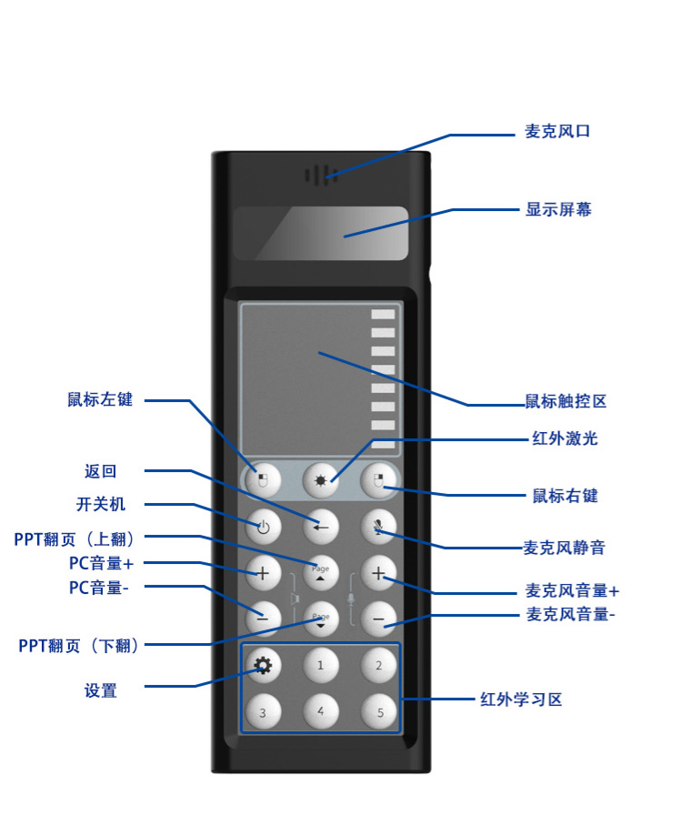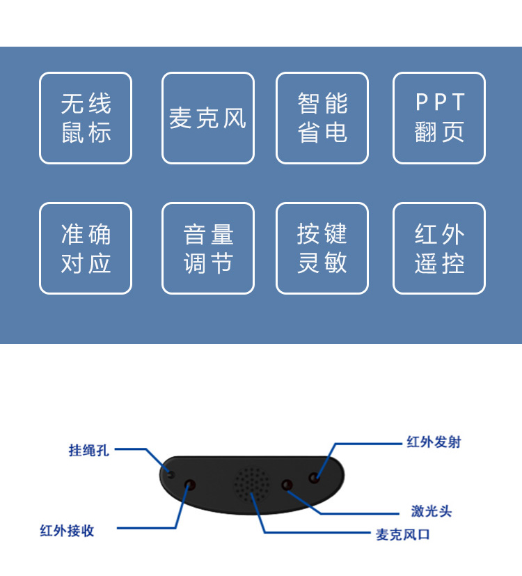 自主研發(fā)集遙控器、鼠標、麥克風、翻頁器、激光筆于一體,支持課件翻頁、課堂擴音等課堂操作功能,產品自帶鋰電池,續(xù)航時間長達8小時,紅外傳輸距離可達20米。