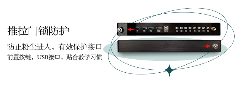 機(jī)身保護(hù)——獨(dú)特的推拉門鎖設(shè)計(jì),保護(hù)前置按鍵及接口,還能收納白板筆和教鞭;