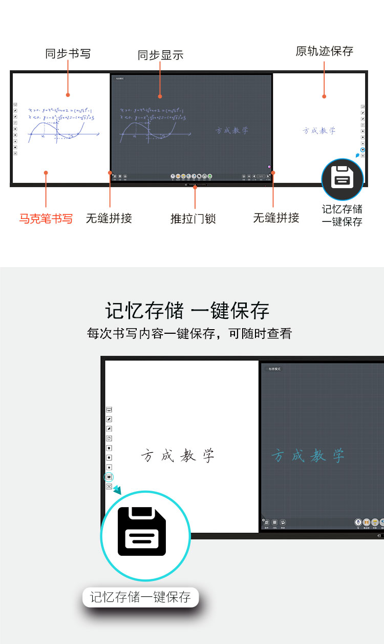 板書教學記憶一體機-記錄板書內容、再現課堂過程、轉化教學資源,板書教學記憶一體機集六大產品于一機,在不改變老師板書習慣的前提下,實現傳統教學與多媒體設備的智慧融合,設定了有板書記憶、板書同步顯示、板書自動分享等多樣化功能,每一個功能的實現都賦予了自己的使命。