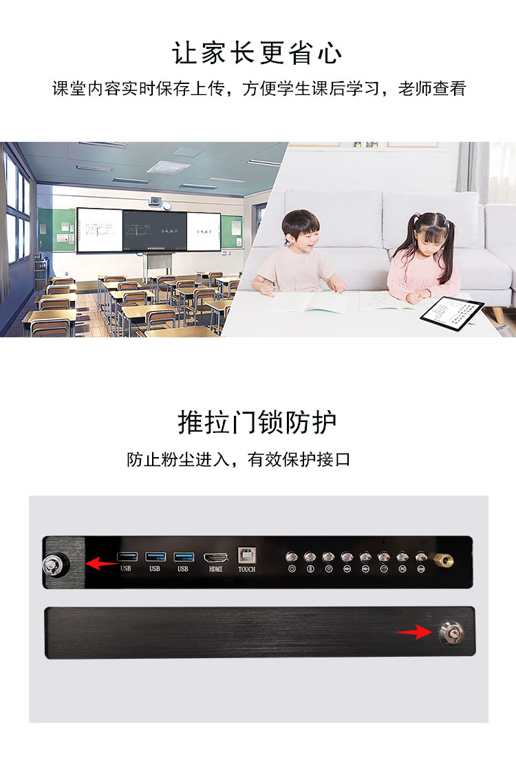 機身保護——獨特的推拉門鎖設計,保護前置按鍵及接口,還能收納白板筆和教鞭;