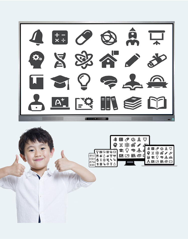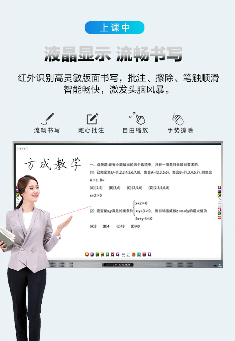 液晶多媒體教學一體機-超窄邊框三等邊超窄邊框設(shè)計,推拉門鎖保護,4K超高清顯示,以人機交互的方式,搭載互動白板和無線投屏軟件,實現(xiàn)多人書寫、互聯(lián)互通的互動教學模式,豐富課堂內(nèi)容,提高學習氛圍。